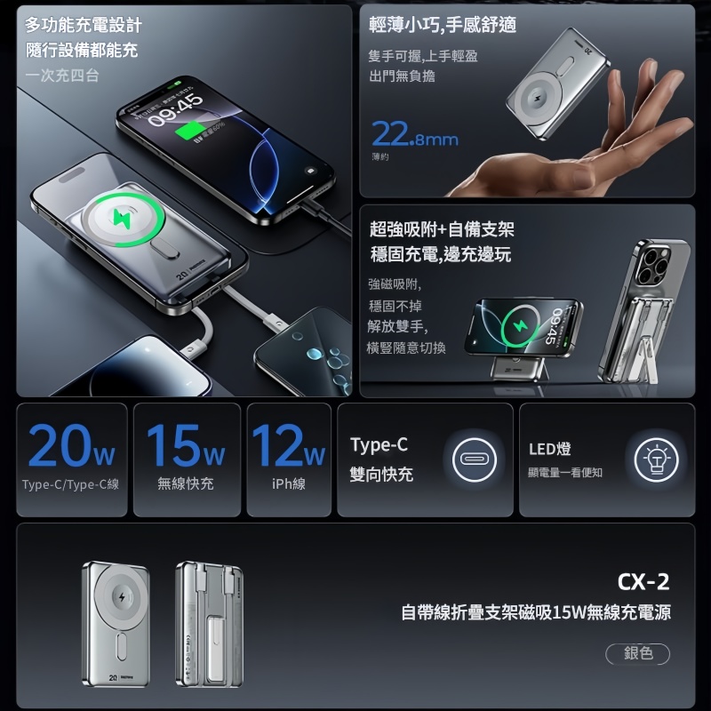 多功能充電設計 隨行設備都能充 輕薄便捷手感舒適 超強吸附+自帶支架 Type-C雙向快充 LED 燈顯LED燈顯電量一看便知