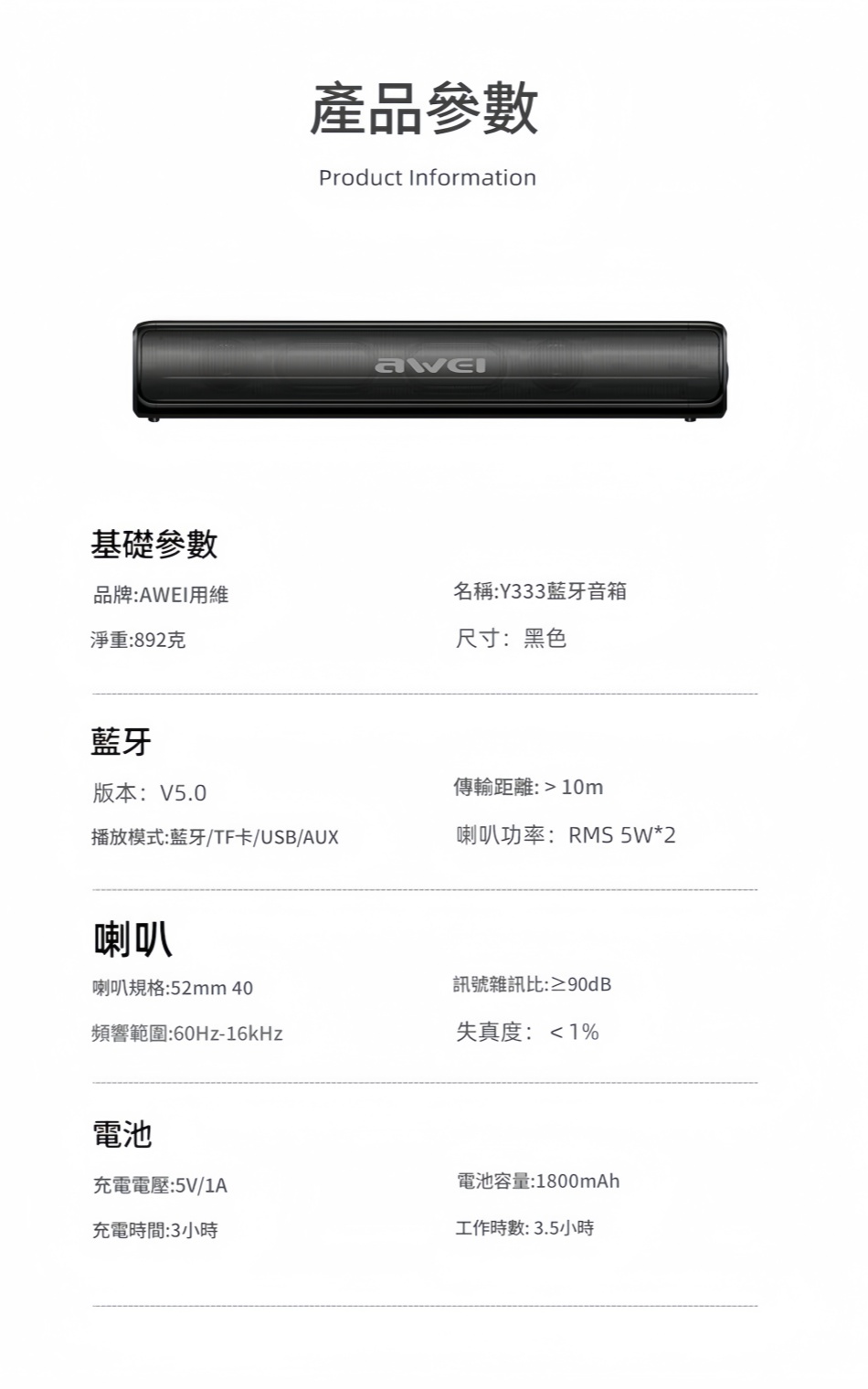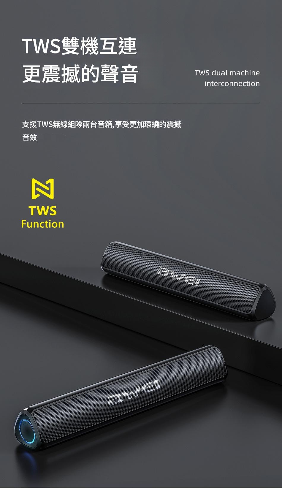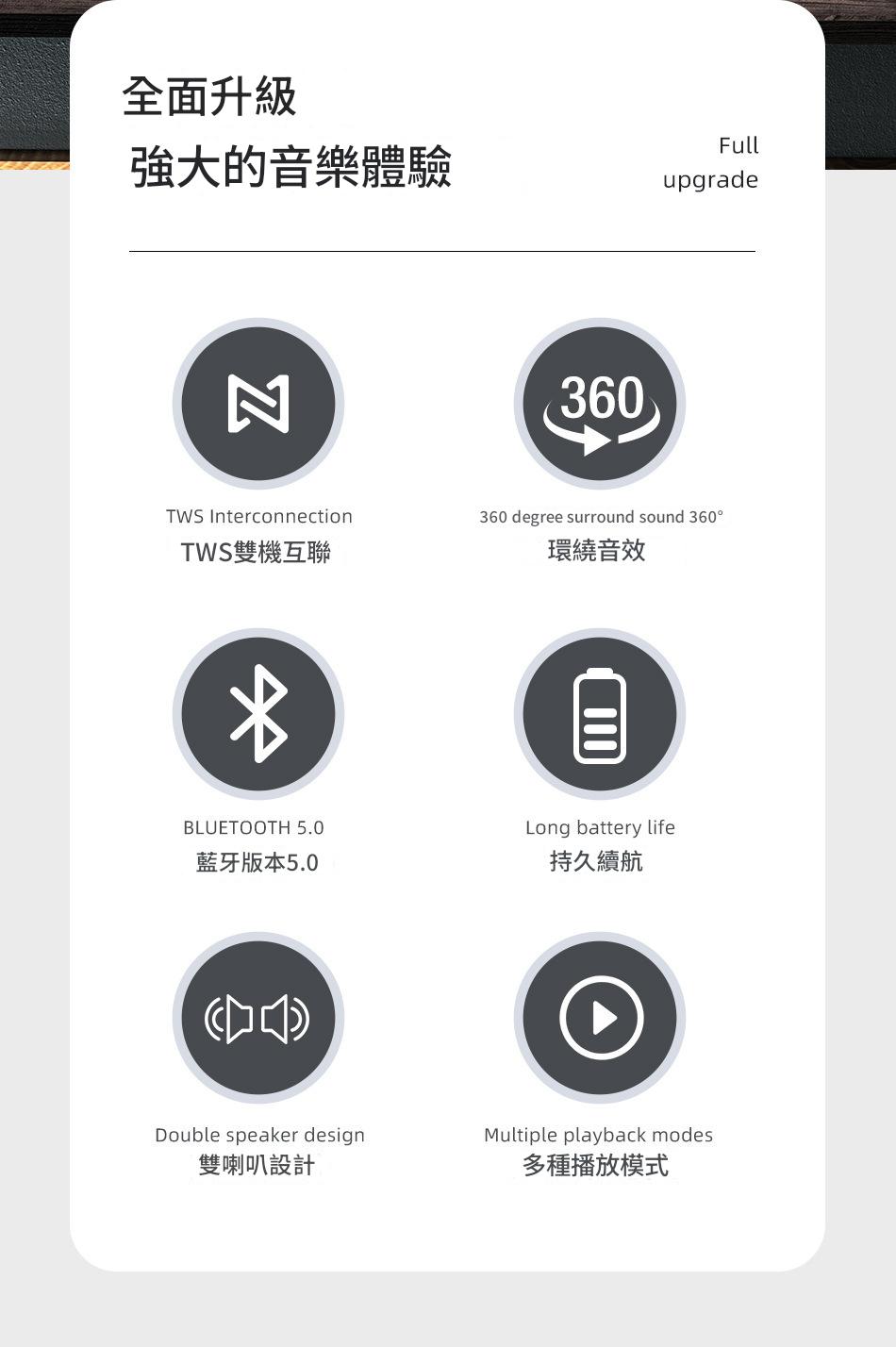 TWS雙機互聯 環繞音效 藍牙版本5.0 持久續航 雙喇叭設計 多種播放模式