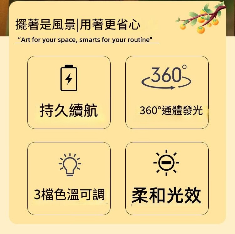 持久續航 360°通體發光 3檔色溫可調 柔和光效