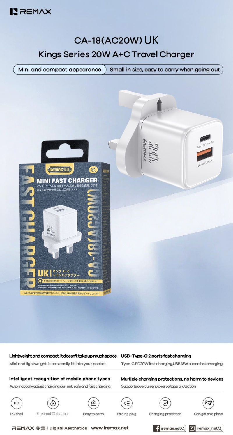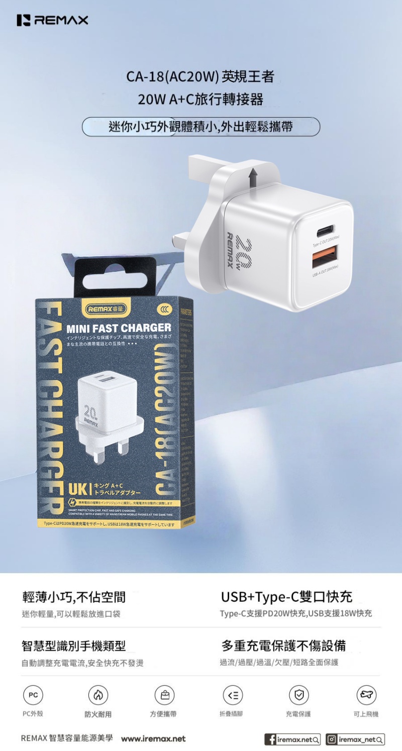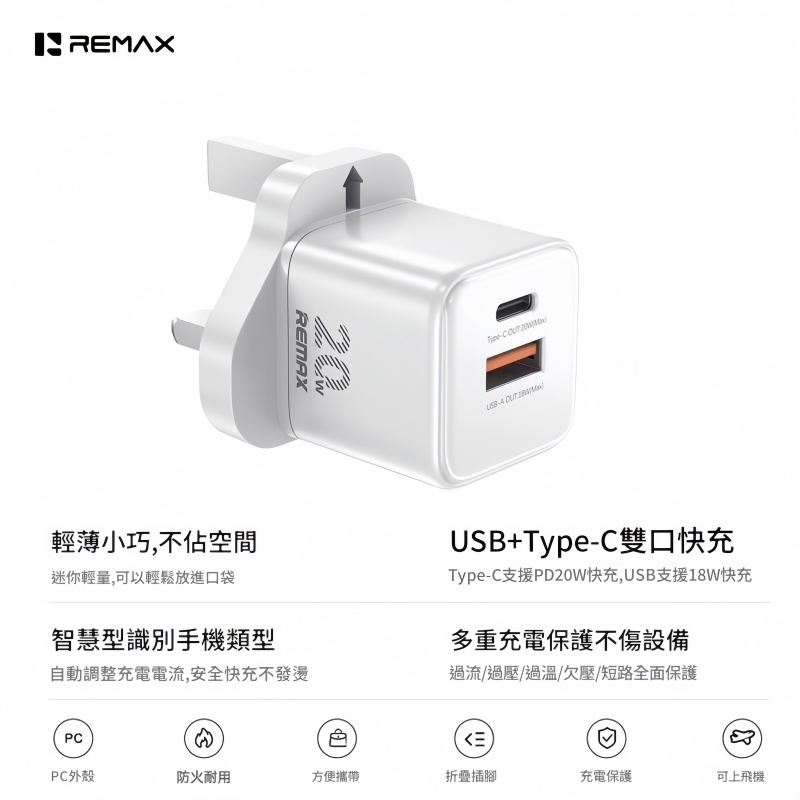 REMAX 王者 20W A+C快充充電器CA-18(AC20W) 充電器/火牛