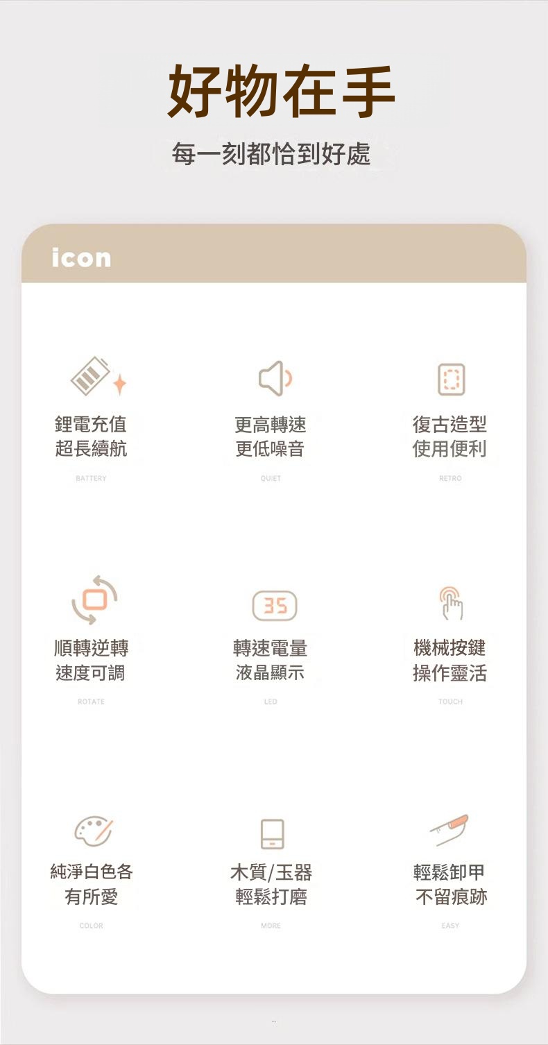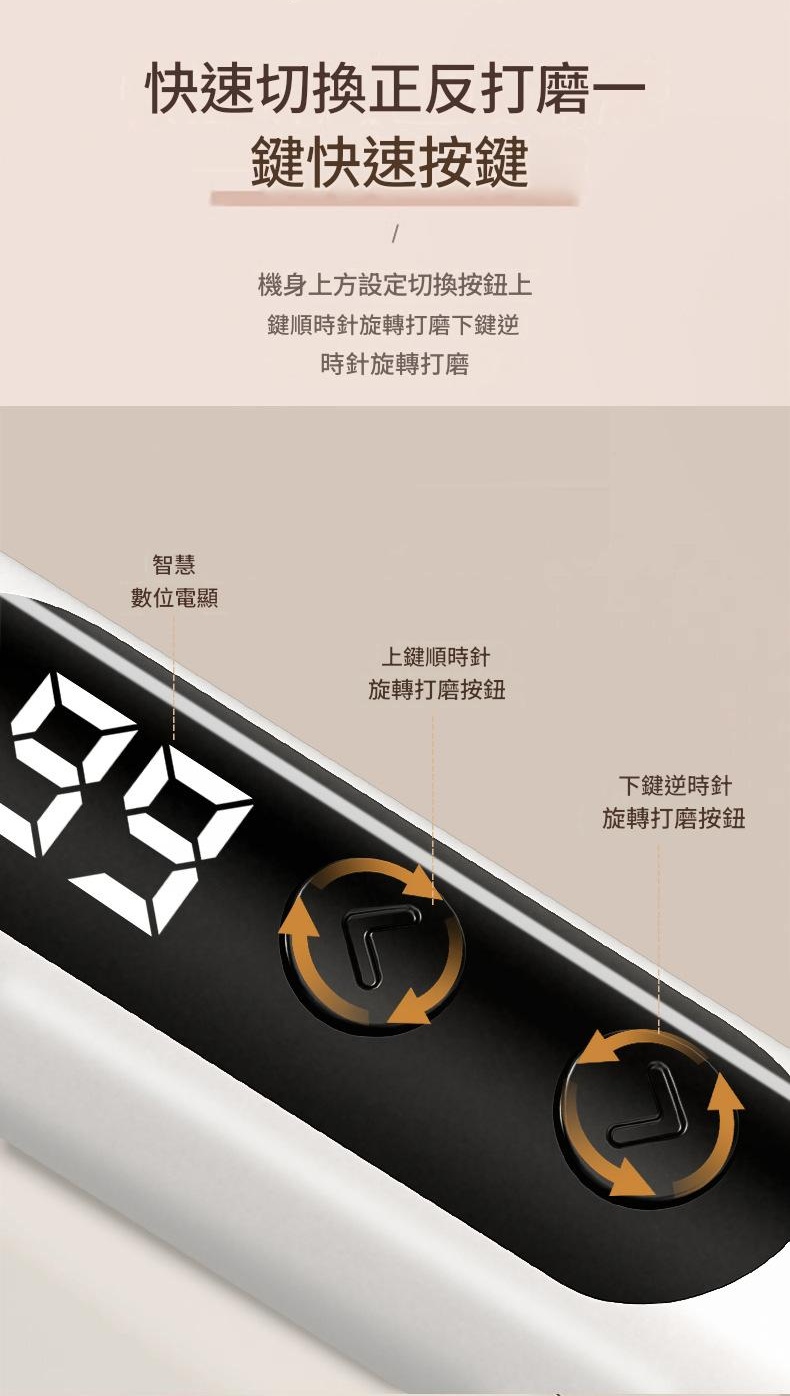 鋰電充電超長續航 更高轉速更低噪音 復古造型使用便捷 順轉逆轉速度可調 轉速電量液晶顯示 機械按鍵操作靈活