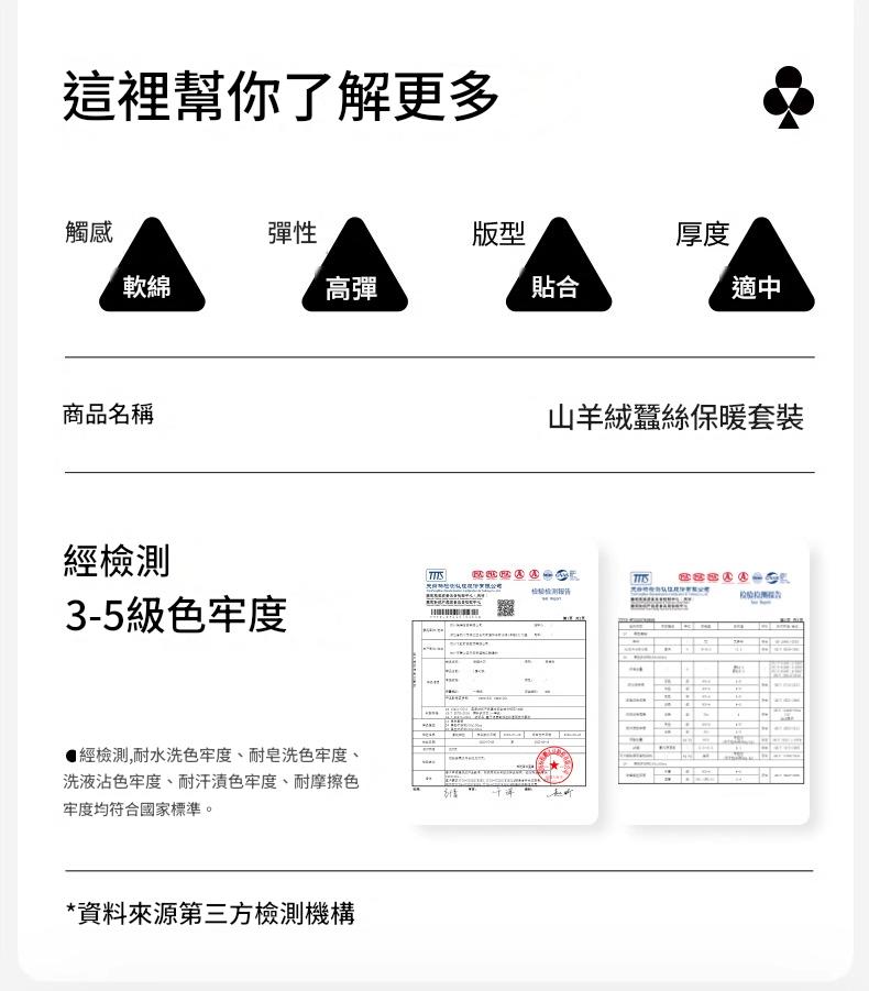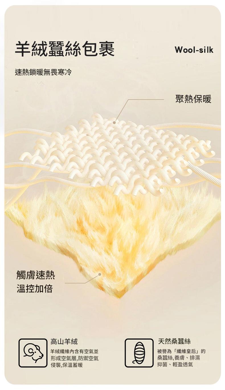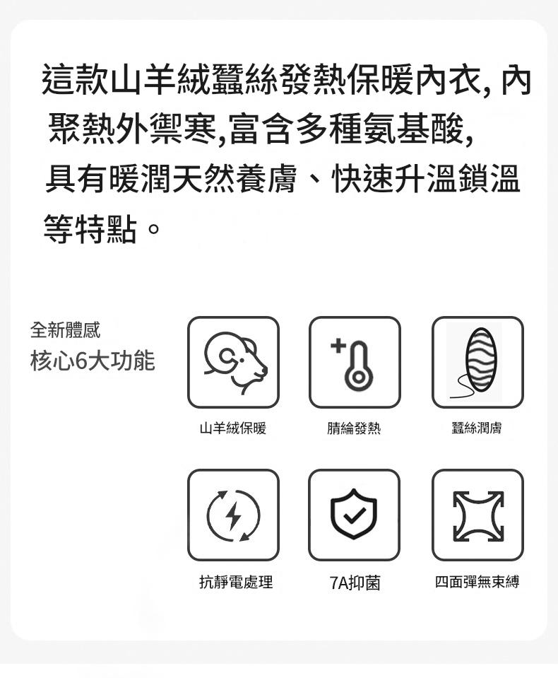 山羊絨保暖 腈綸發熱 蠶絲潤膚 抗靜電處理 7A抑菌 四面彈無束縛
