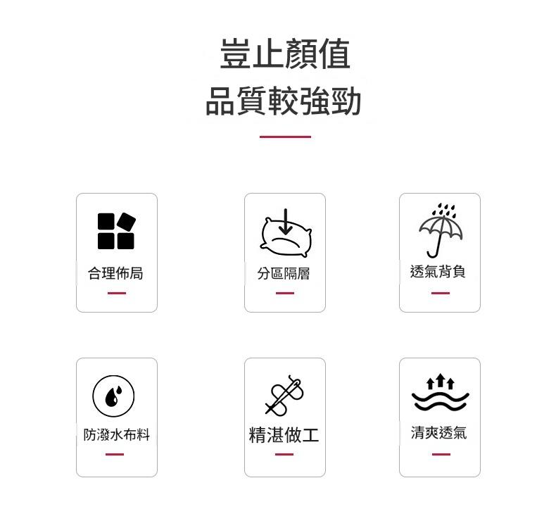 合理佈局 分區隔層 透氣背負 防潑水布料 精湛做工 清爽透氣