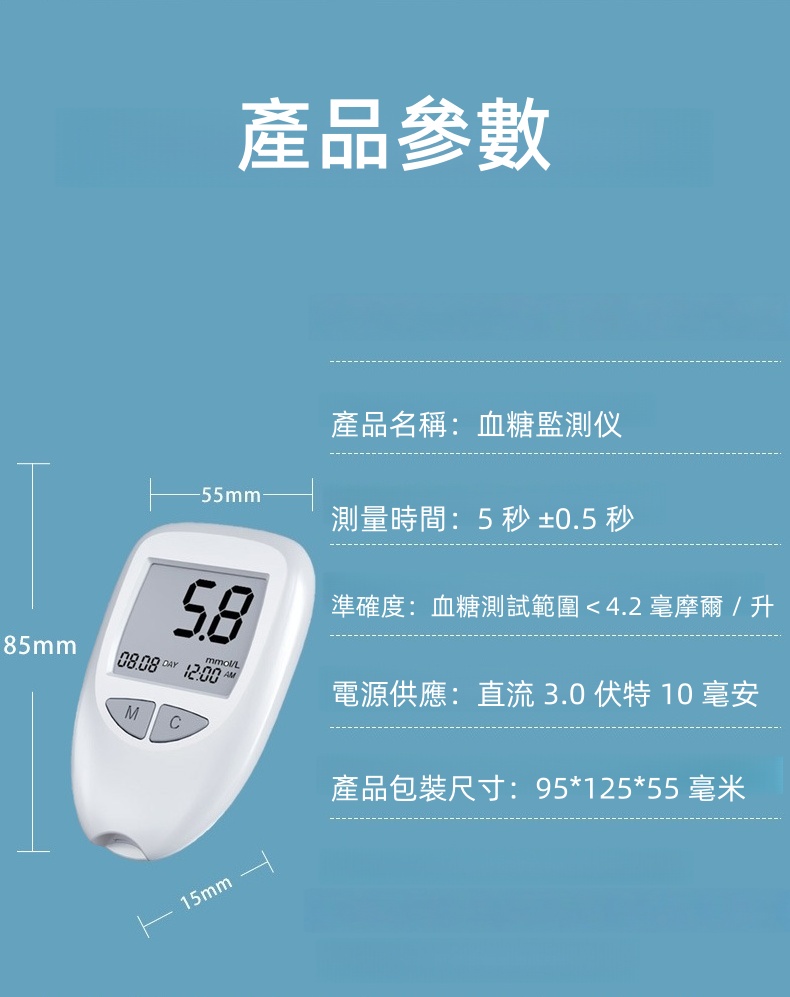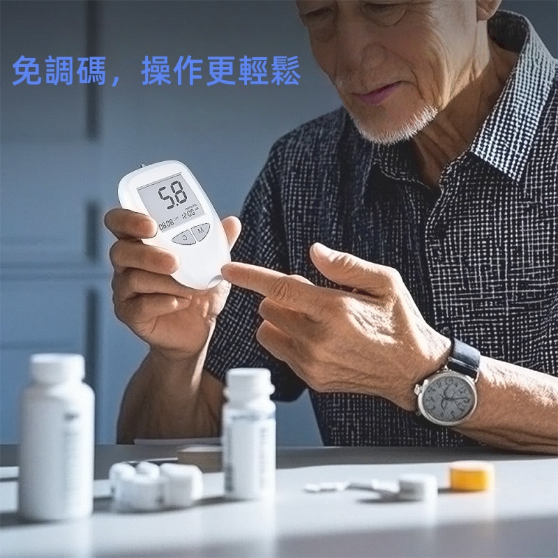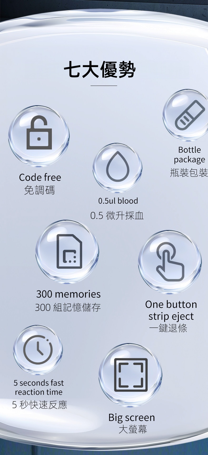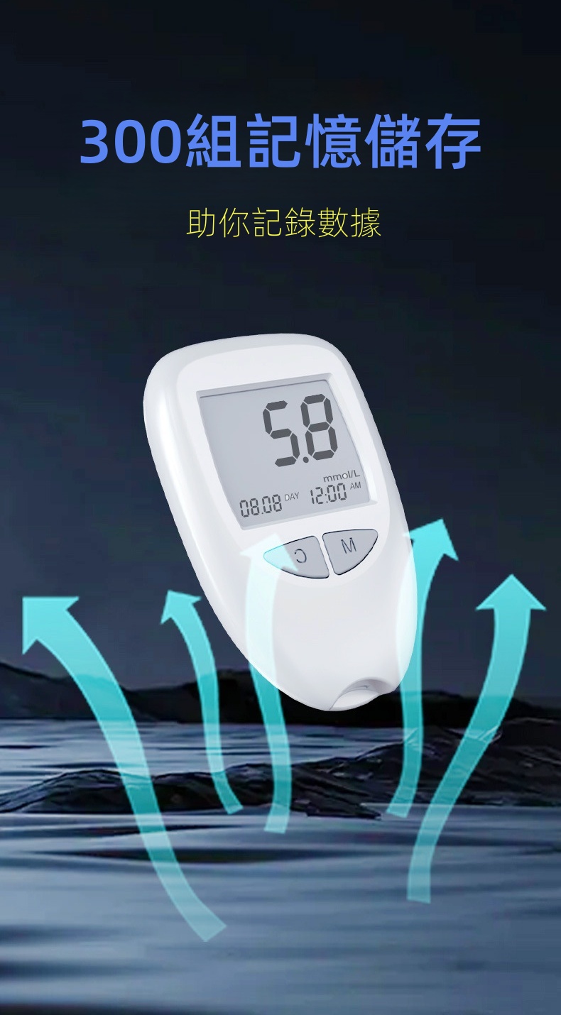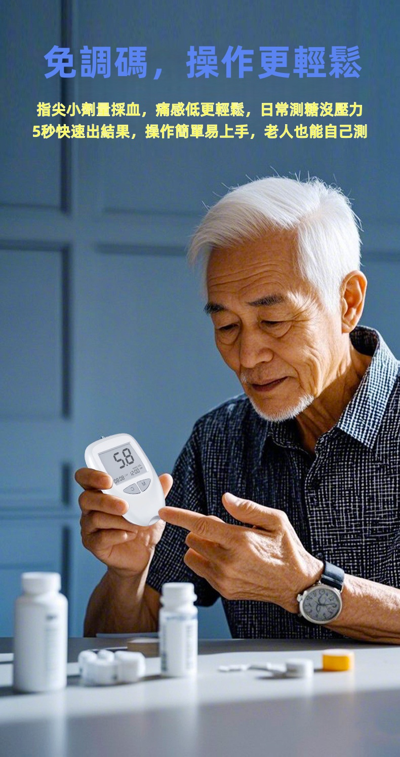 免調碼 0.5微升採血 瓶裝包裝 300組記憶儲存 一鍵退條 5秒快速反應時間 大螢幕