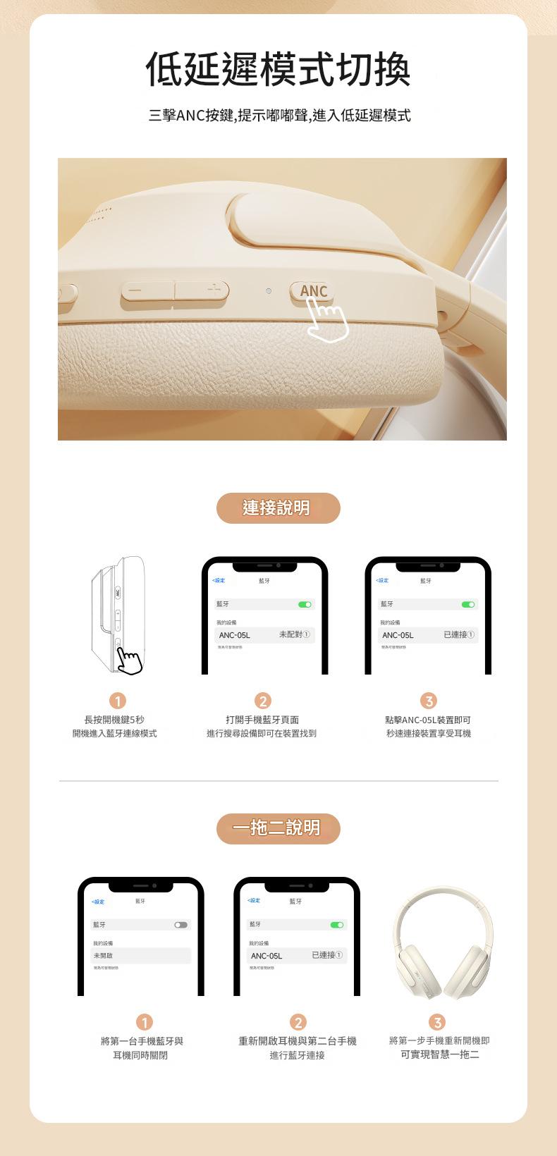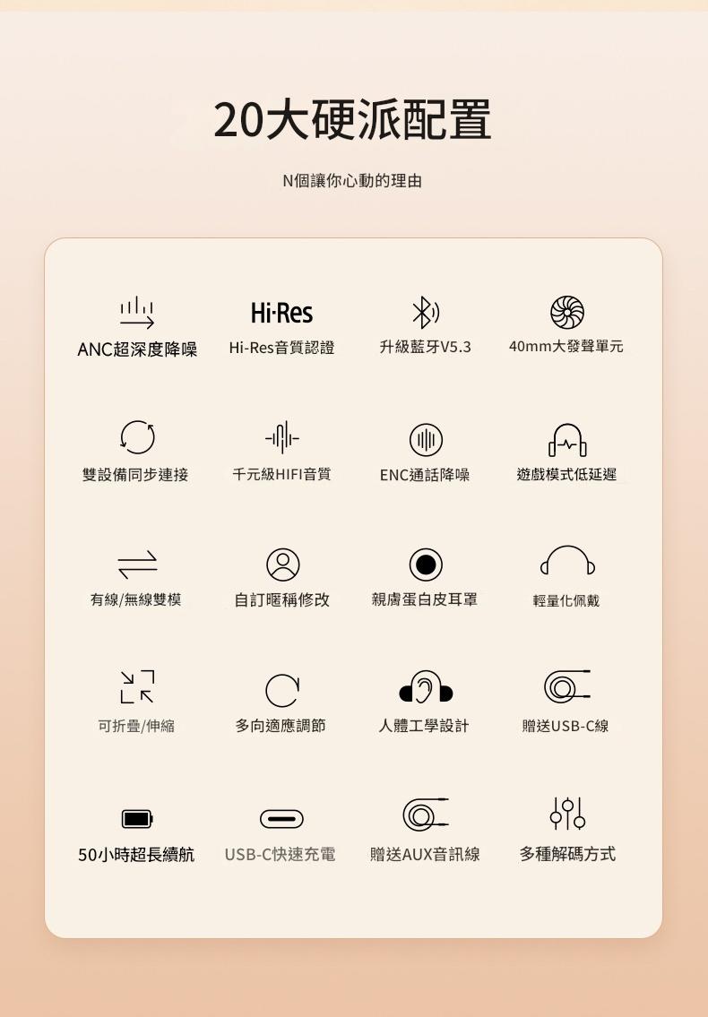 Hi-Res音質認證 -40dB深度降噪 定製40mm發聲單元 藍牙5.3遊戲模式 有線無線雙連接