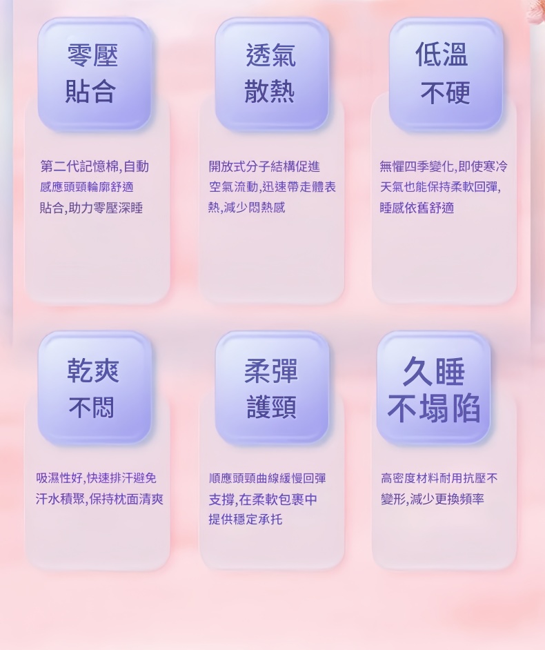 零壓貼合 透氣散熱 低溫不硬 乾爽不悶 柔彈護頸 久睡不塌陷