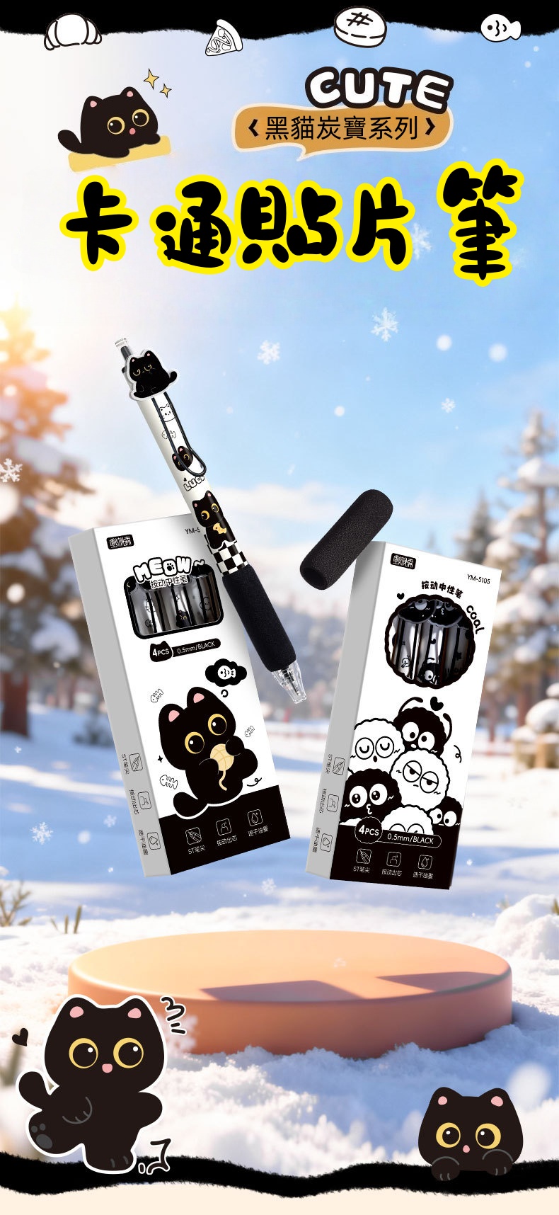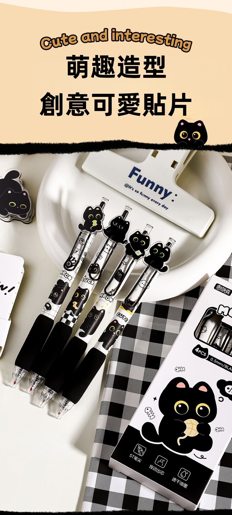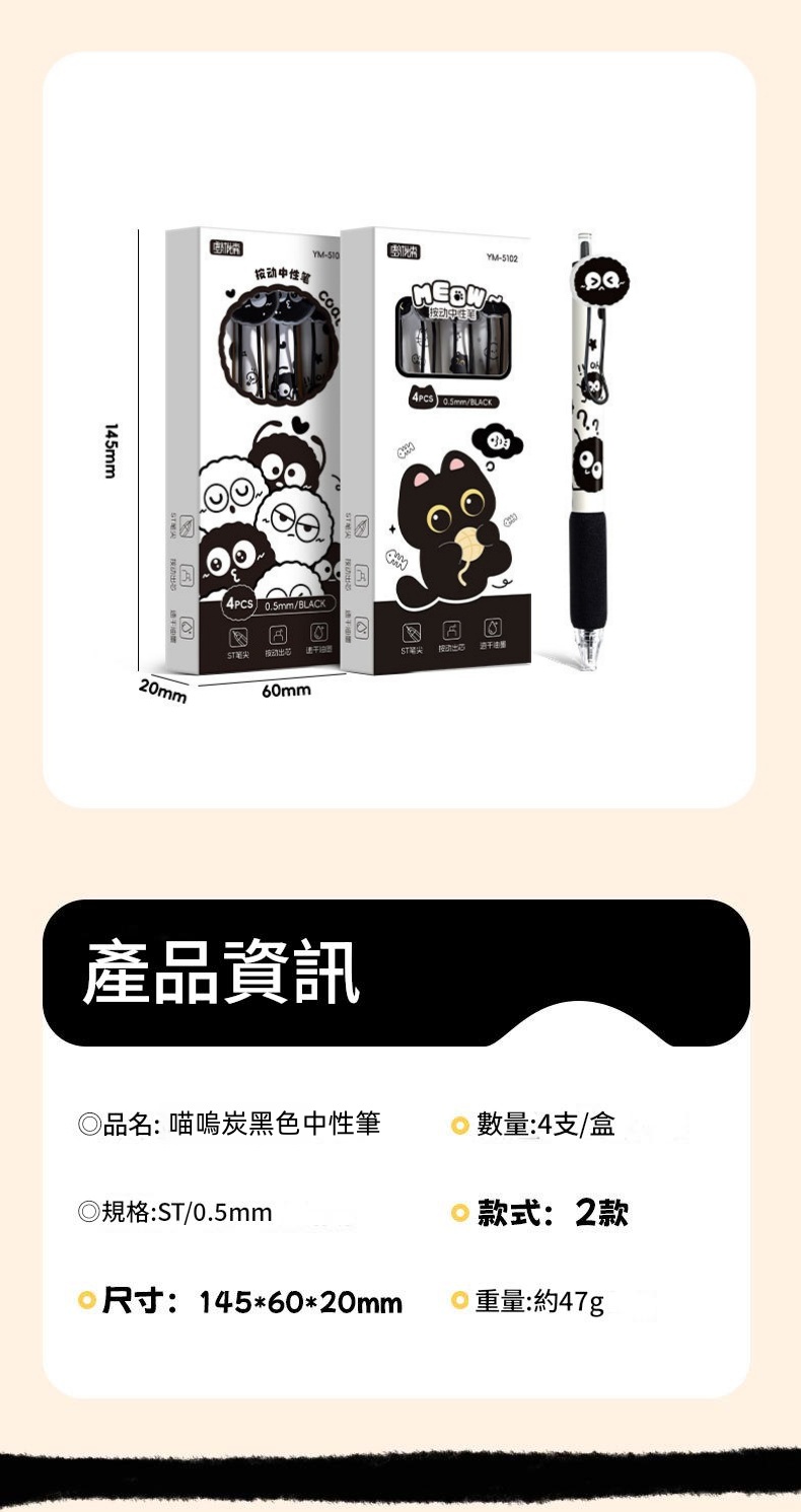 喵嗚炭黑色中性筆(4支裝) 啫喱筆/水筆