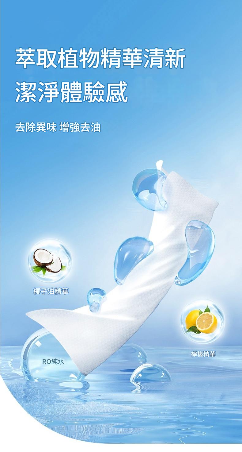 椰子油精華、檸檬精華、超柔無紡佈、RO 純水、烷基糖苷(APG)等
